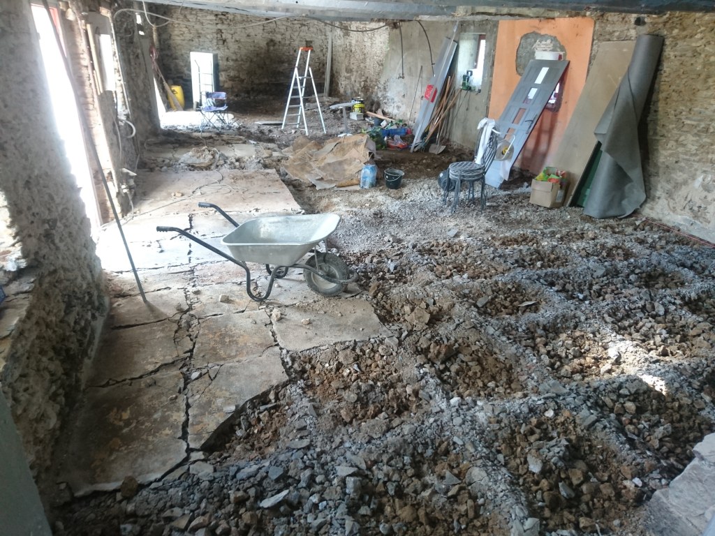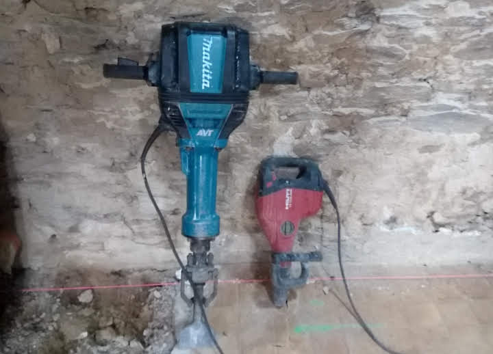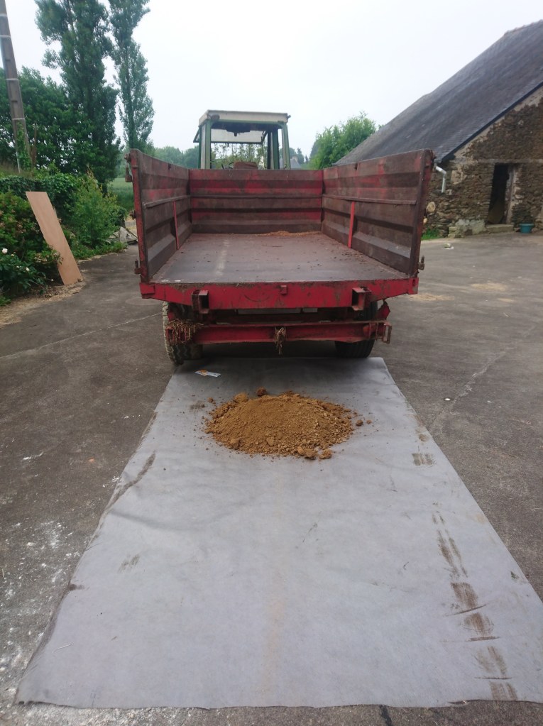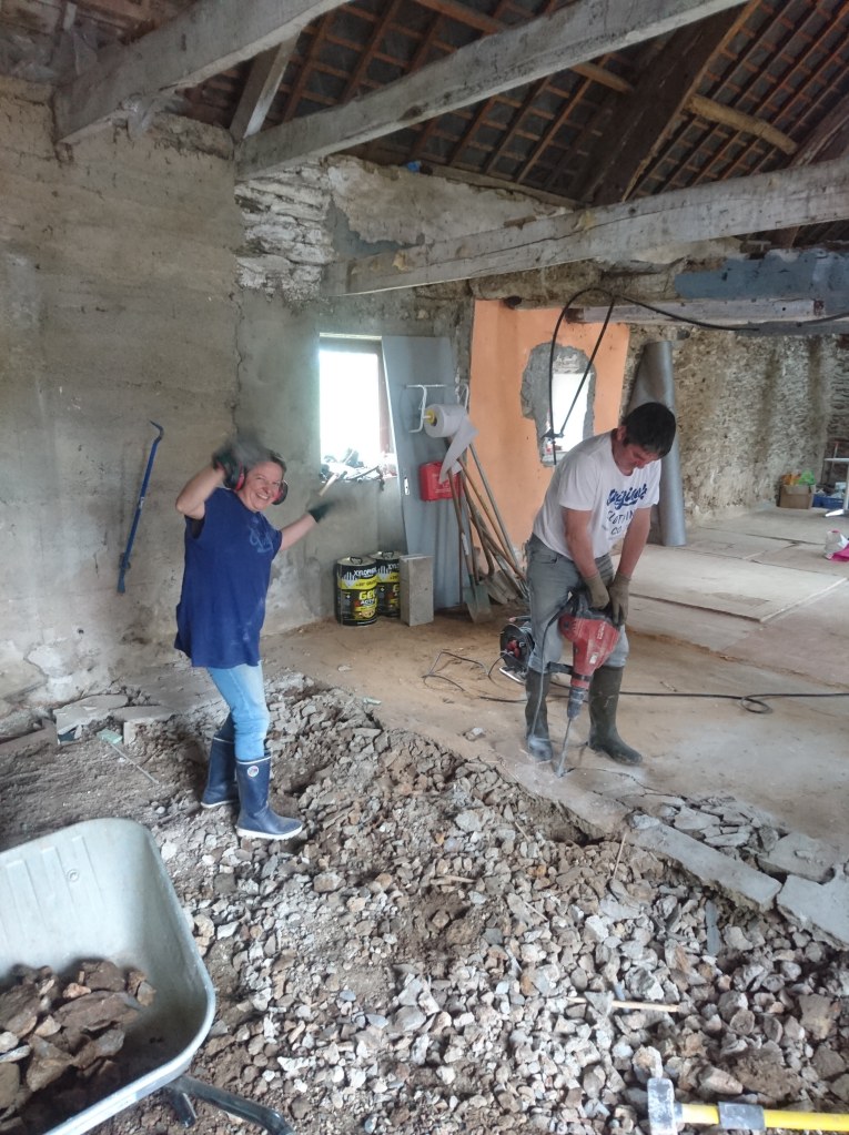 On à fini par louer un marteau piqueur, qui, comparé ou perforateur n’a rien à voir. Ça file tout seul, mais ça casse les bras ! On donc fini par trier des cailloux, le dos en à pris plein la tête.