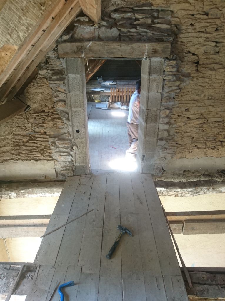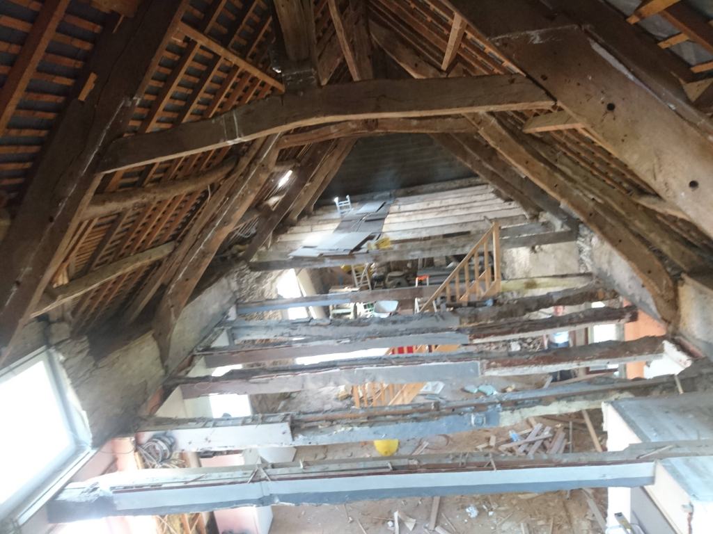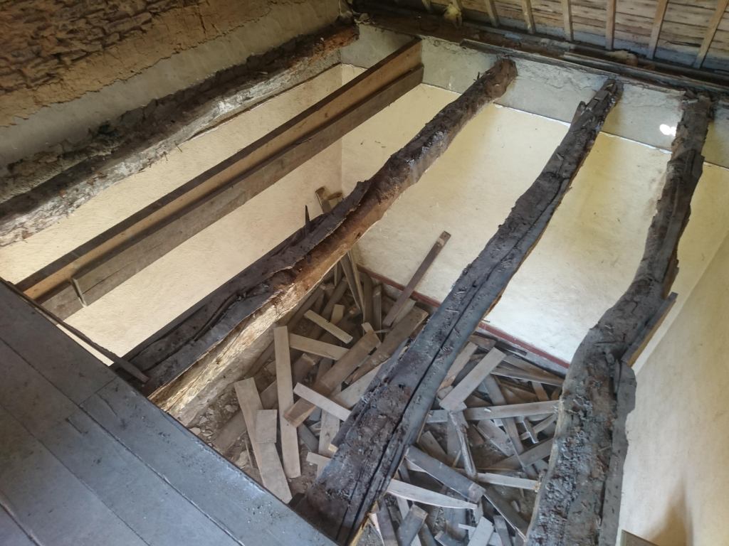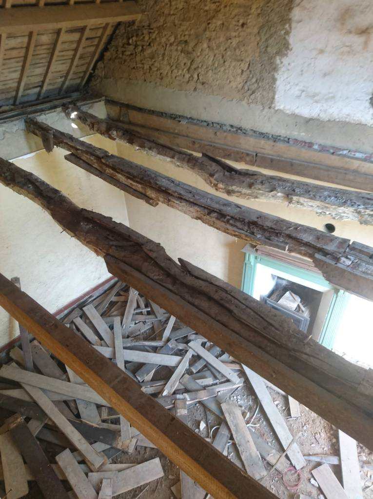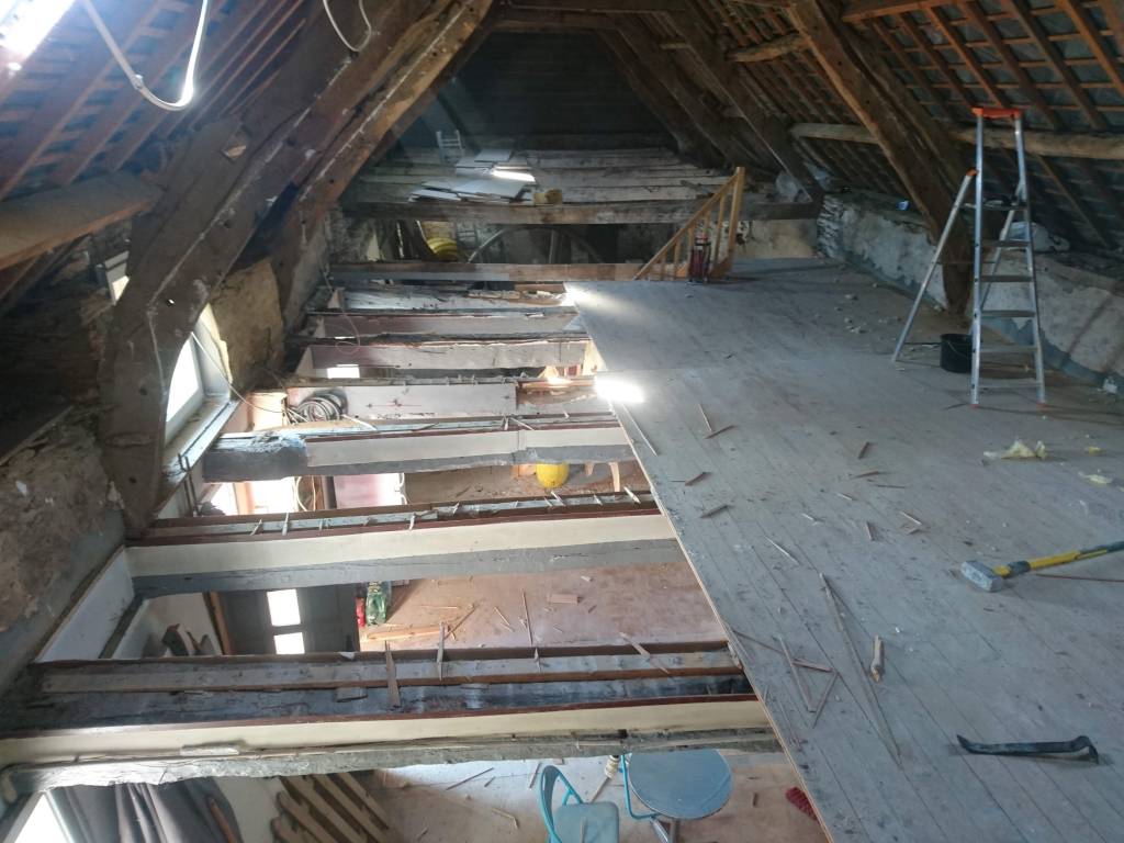 C’est partie pour virer tout le plancher de l’étage. Beaucoup de poussière, de bois attaqué et découverte de poutre très attaquées, qui avaient déjà consolidées par des bastaings.