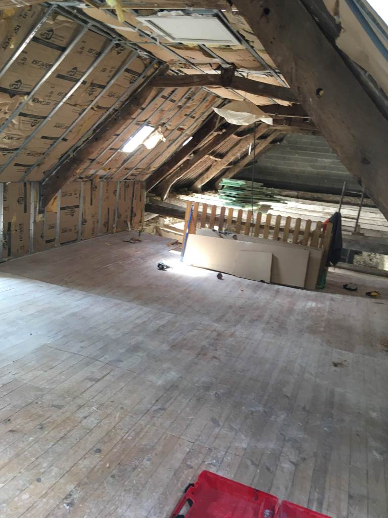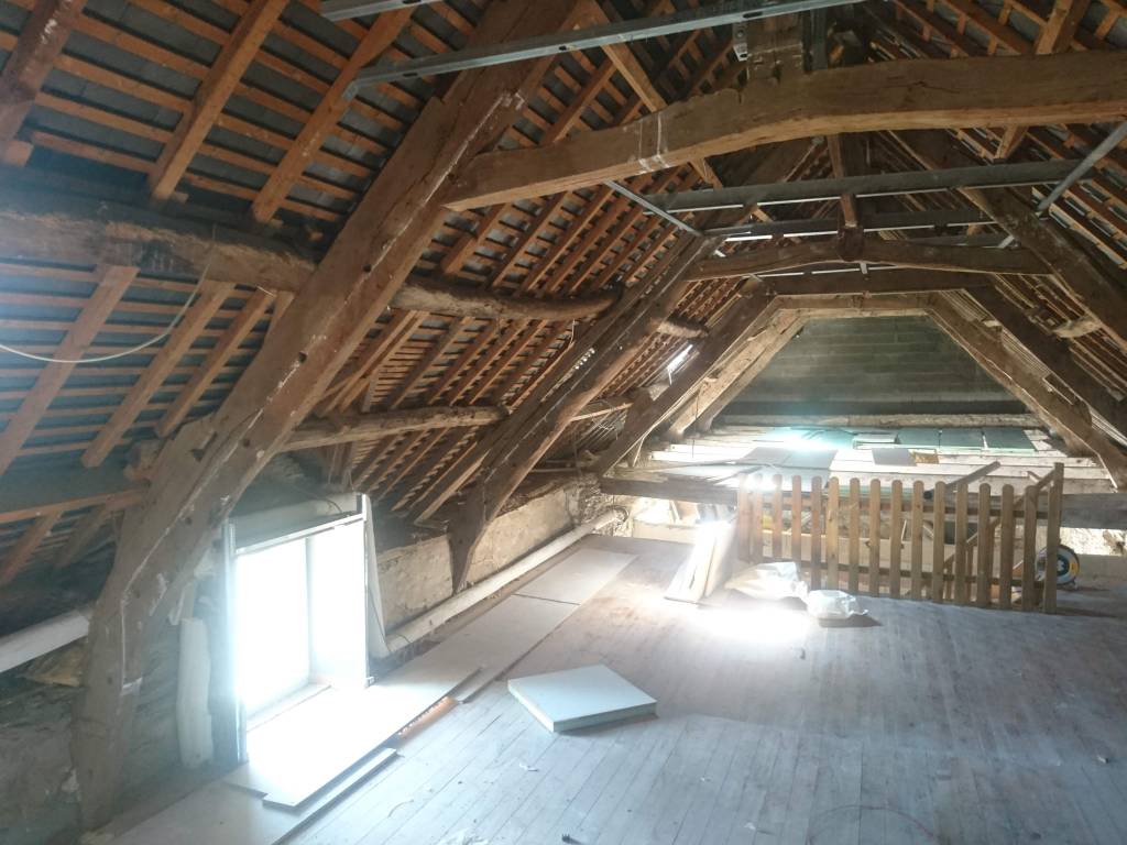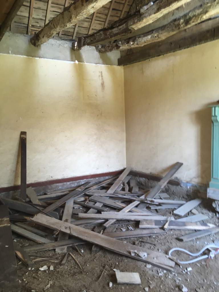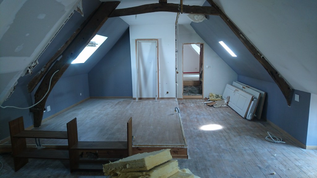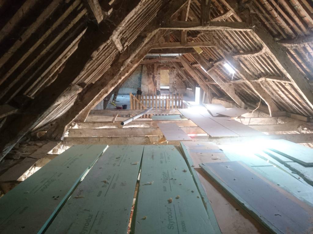 C’est partie pour virer tout le plancher de l’étage. Beaucoup de poussière, de bois attaqué et découverte de poutre très attaquées, qui avaient déjà consolidées par des bastaings.