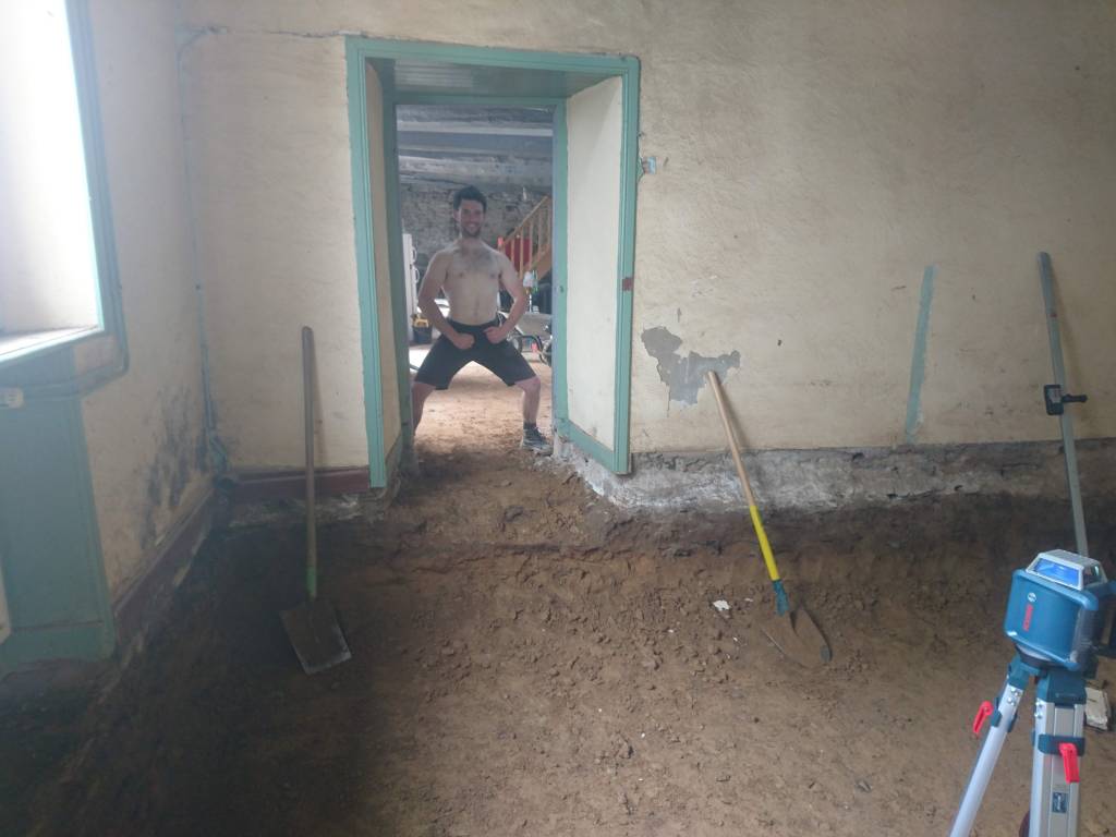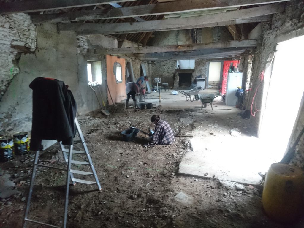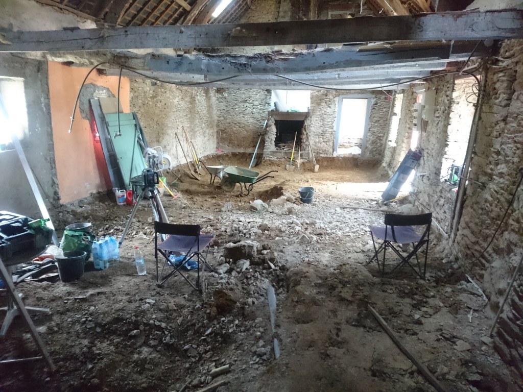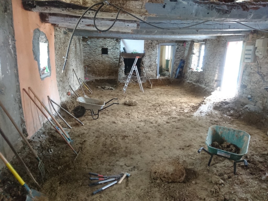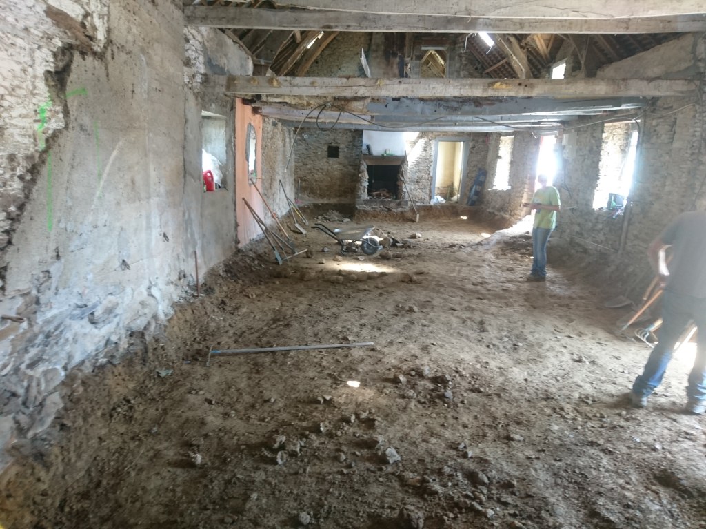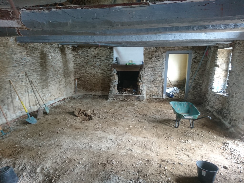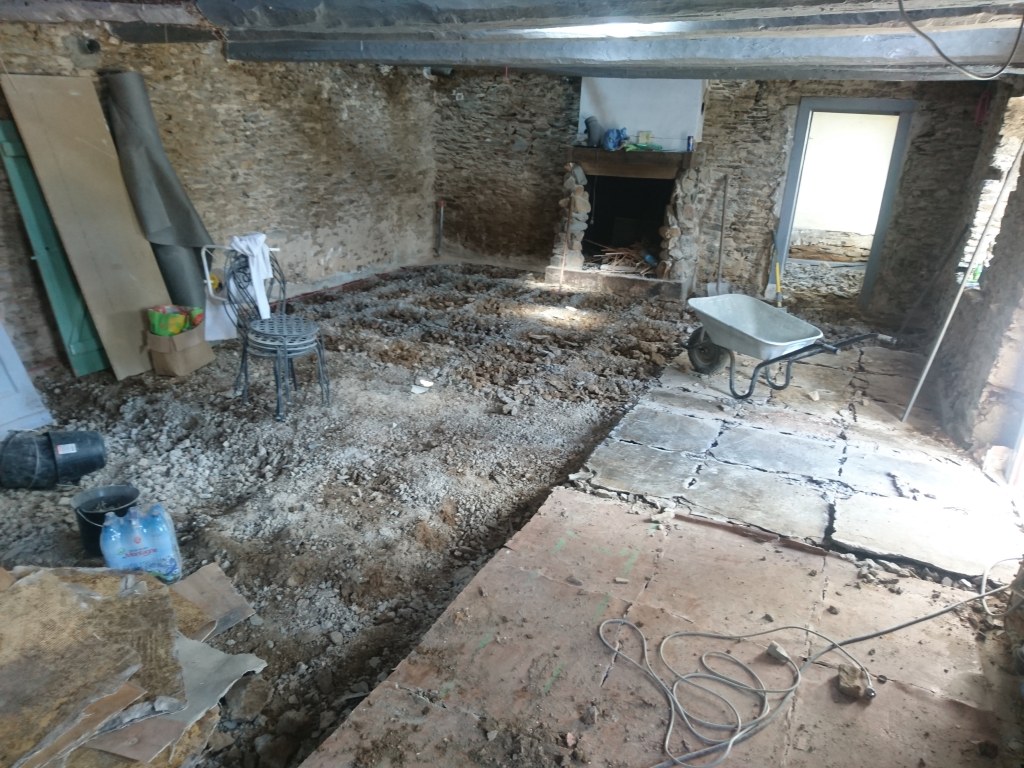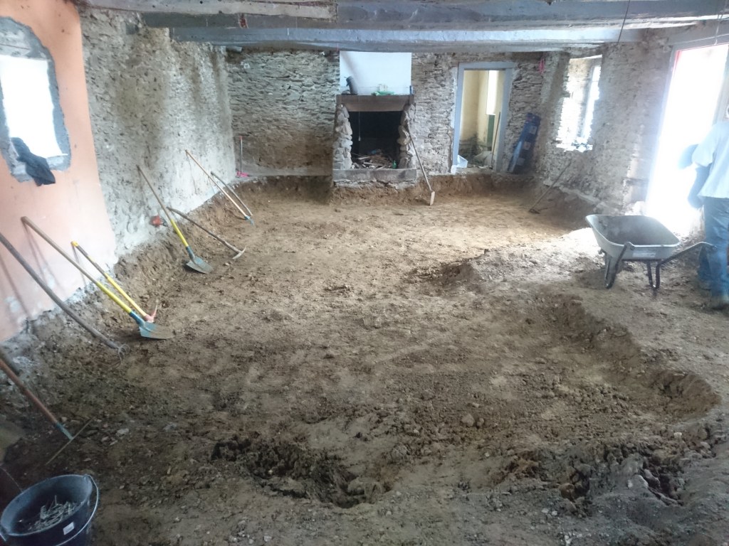 Le lendemain on à profité de la visite d’un couple d’ami pour décaisser ce qui était sous le parquet de la chambre du bas, les chevrons étaient directement posés sur des pierres de schiste, à même la terre battue. Dans la journée on a simplement pu faire une pièce d’environ 22m². Tout sera décaissé à la main, madame refusant qu’un mini-pelle rentre dans la maison de peur que je fasse s’effondrer un mur !!