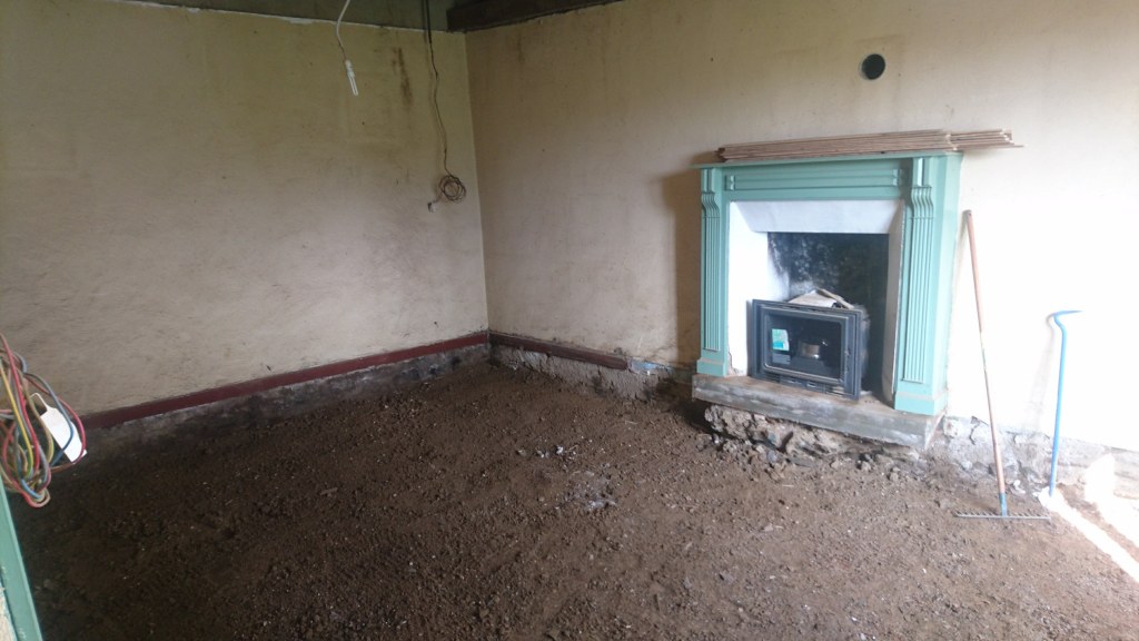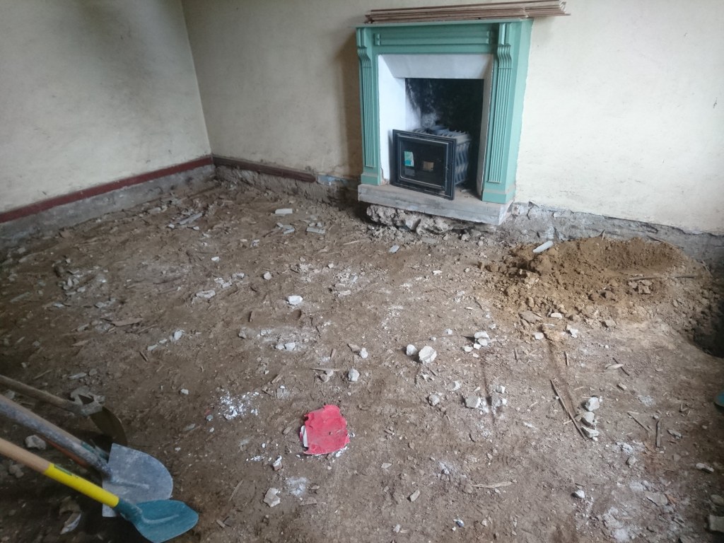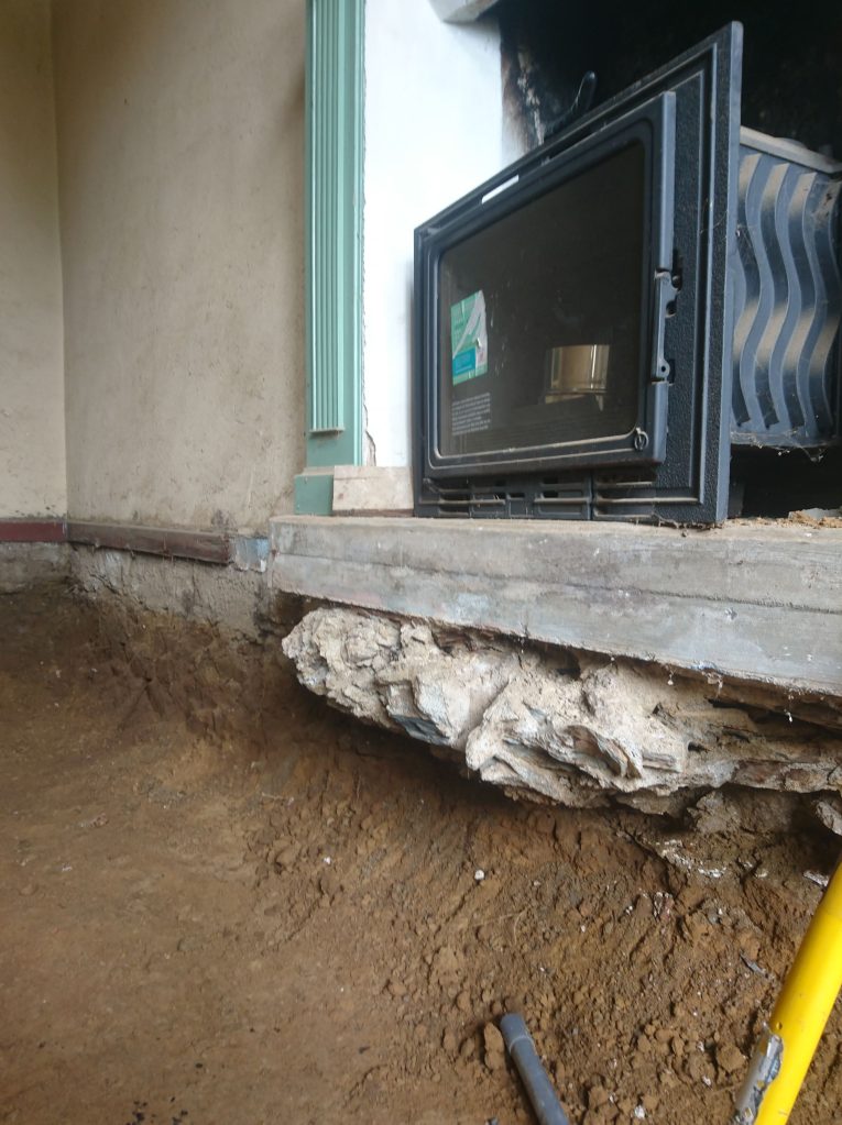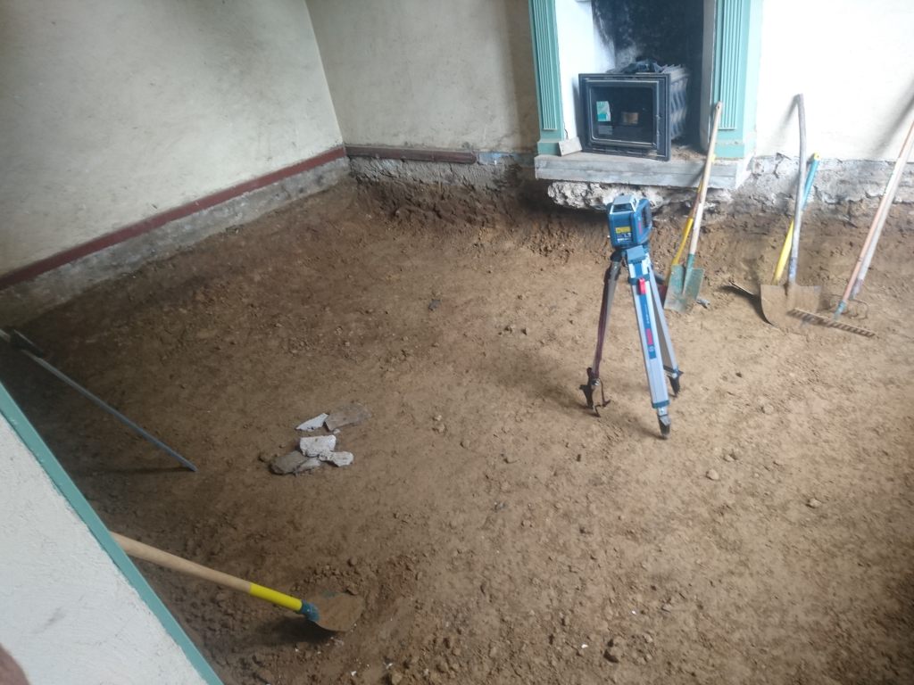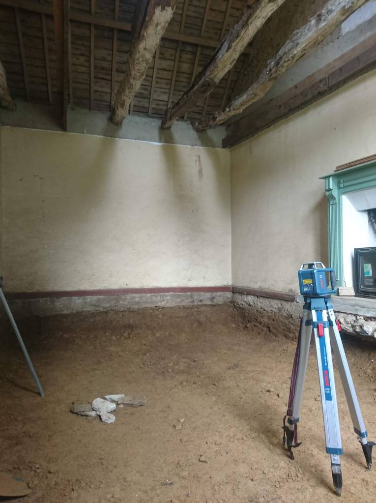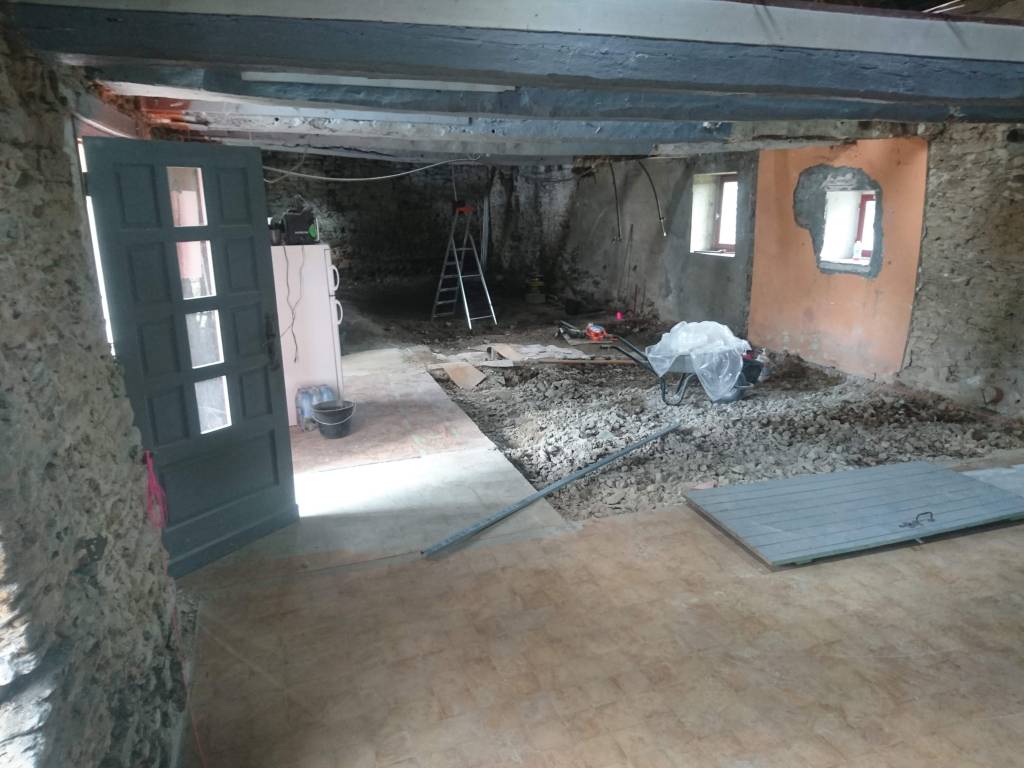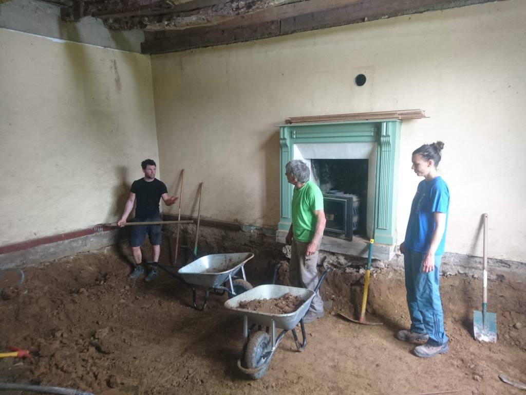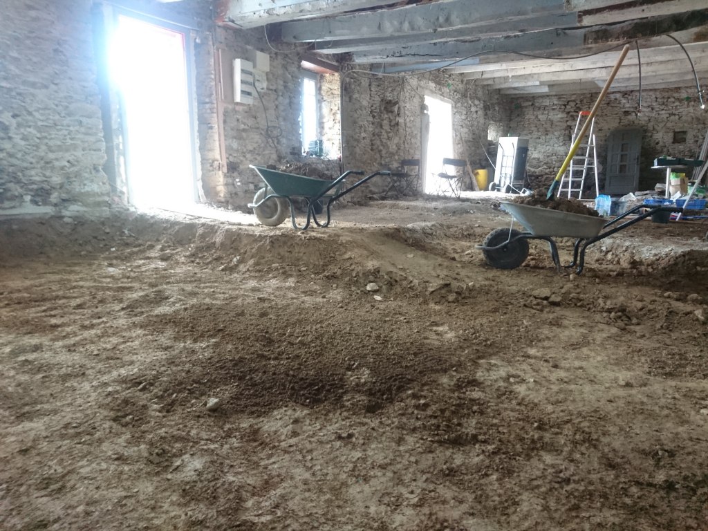 Le lendemain on à profité de la visite d’un couple d’ami pour décaisser ce qui était sous le parquet de la chambre du bas, les chevrons étaient directement posés sur des pierres de schiste, à même la terre battue. Dans la journée on a simplement pu faire une pièce d’environ 22m². Tout sera décaissé à la main, madame refusant qu’un mini-pelle rentre dans la maison de peur que je fasse s’effondrer un mur !!