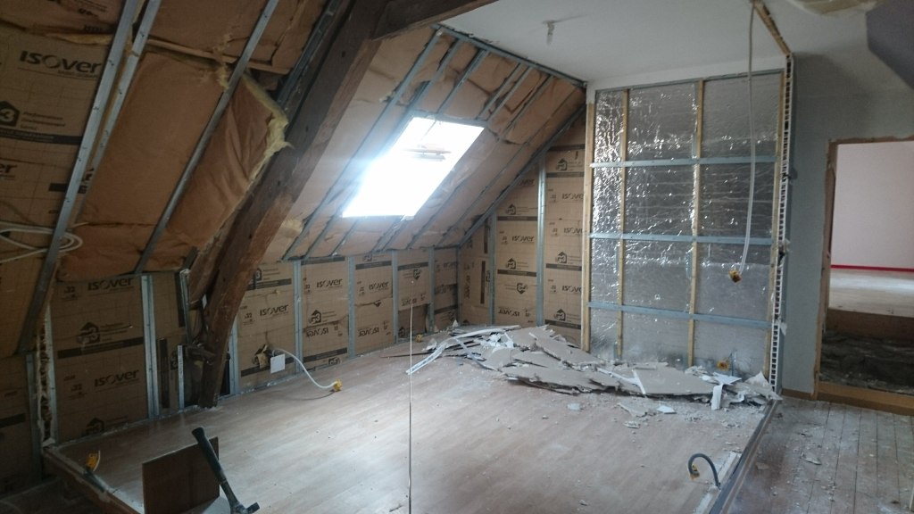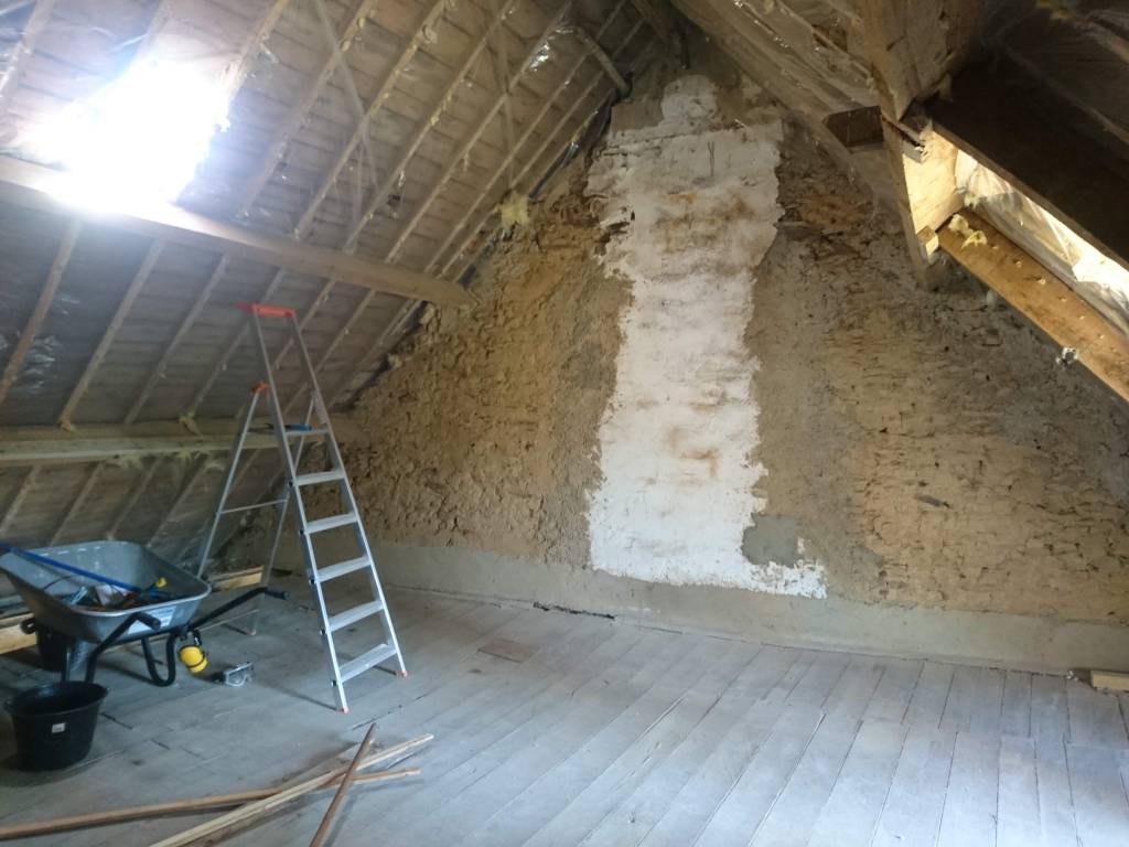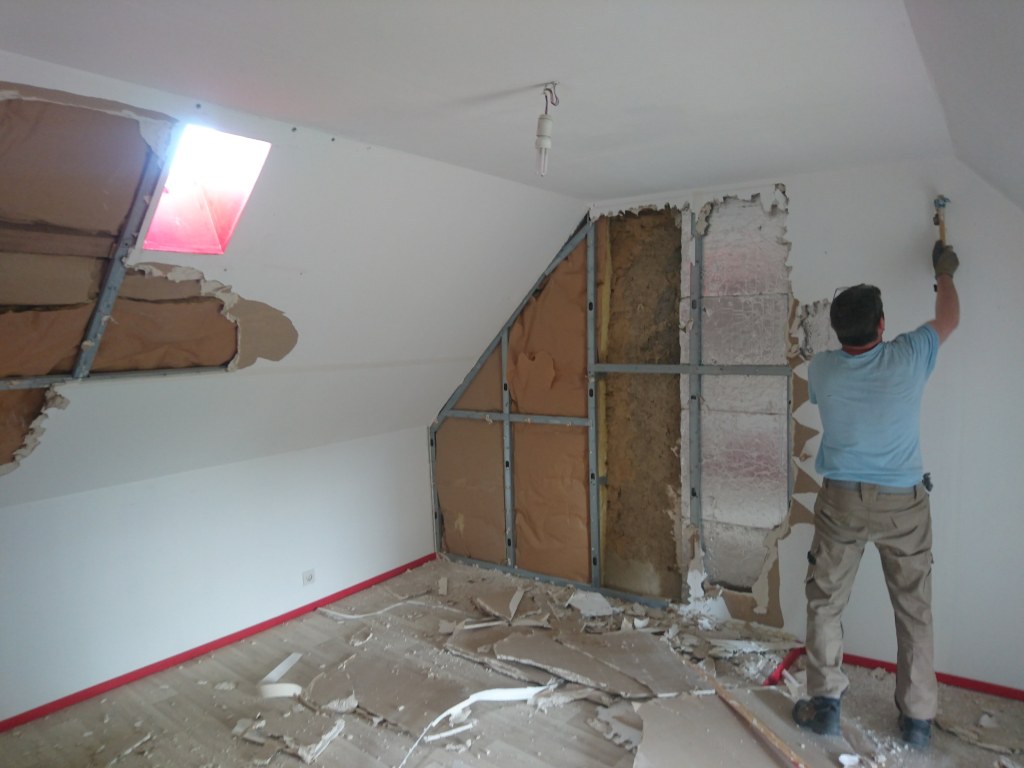 Les jours se suivent et les doigts souffrent des vibrations. Je me suis laissé distraire par l’enduit présent sur les murs. On l’a enlevé car au diagnostique immobilier fait pour la vente ils avaient trouvé de la peinture au plomb dessus.