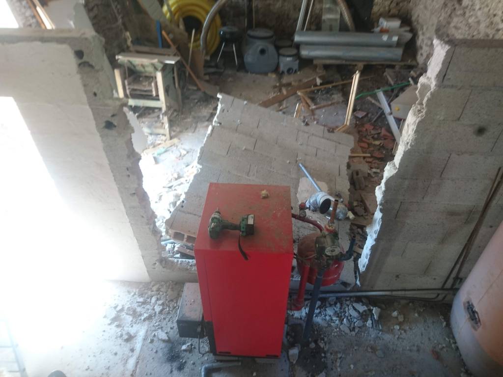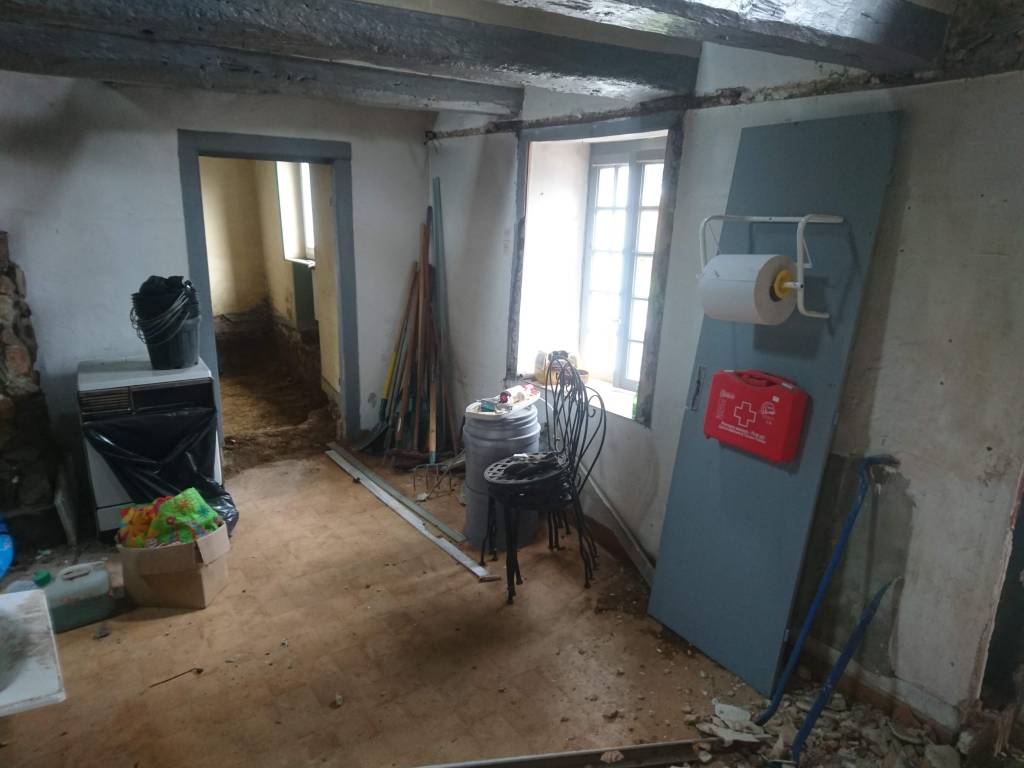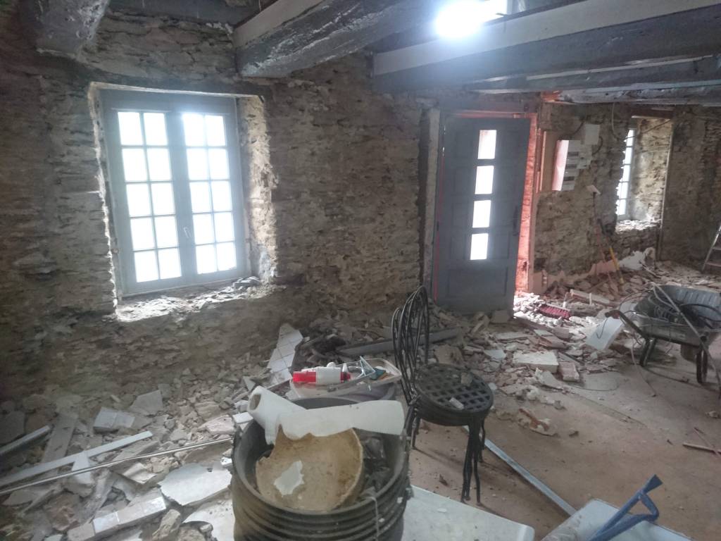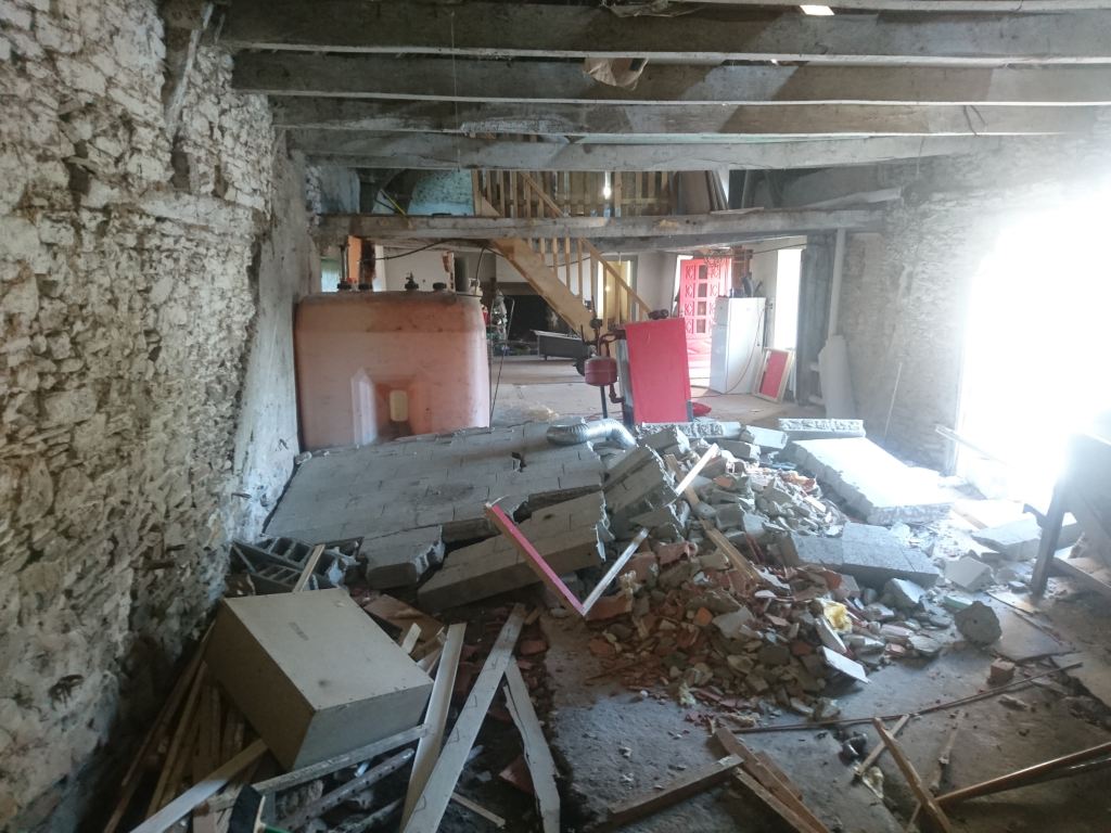Le lendemain, la même, déchetterie et dépose du mur en agglo séparent la buanderie de la partie « grange ».