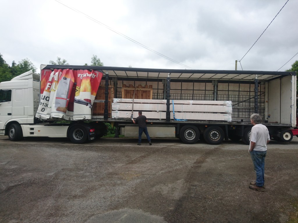 Et voila, s’en est terminé pour la dalle béton, à nous le décaissement de la maison à la houe, la pioche, la bêche et la griffe. Les brouettes sont chaudes comme la braise. Je ne vais pas multiplier la postes, ca à pris quasiment une semaine, qui à été marqué par la livraison des poutres en lamellé collé.