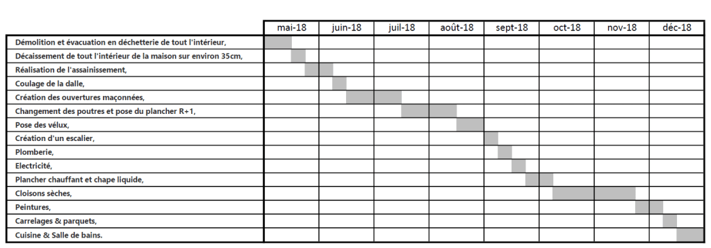 Avant de me lancer, j’avais réalisé une petit planning afin d’avoir une date estimée de fin de travaux. Il faut savoir, que j’ai prévu de rénover à temps plein, je serais donc sans emploi et sans source de revenus pendant les travaux.