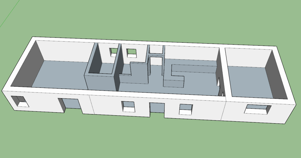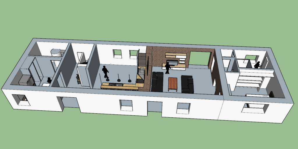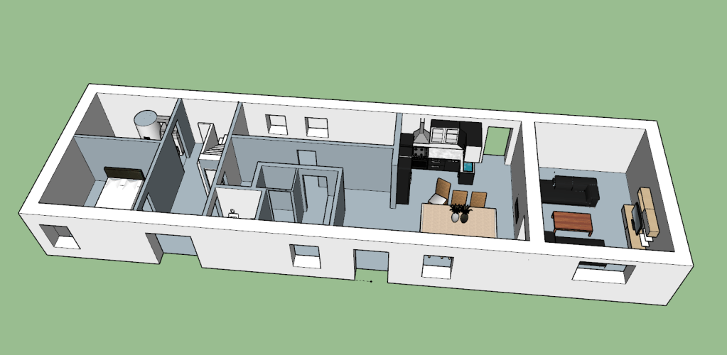 Une fois propriétaire, nous avons pu finaliser notre projet de rénovation, qui devait permettre de concilier nos envies, notre budget et nos capacités techniques. A partir de mesures prise sur place, nous avons commencer à modéliser en 3D (logiciel gratuit « Sketchup » https://www.sketchup.com/fr/plans-and-pricing/sketchup-free) différentes solutions concernant le RDC, et des esquisse pour l’étage.