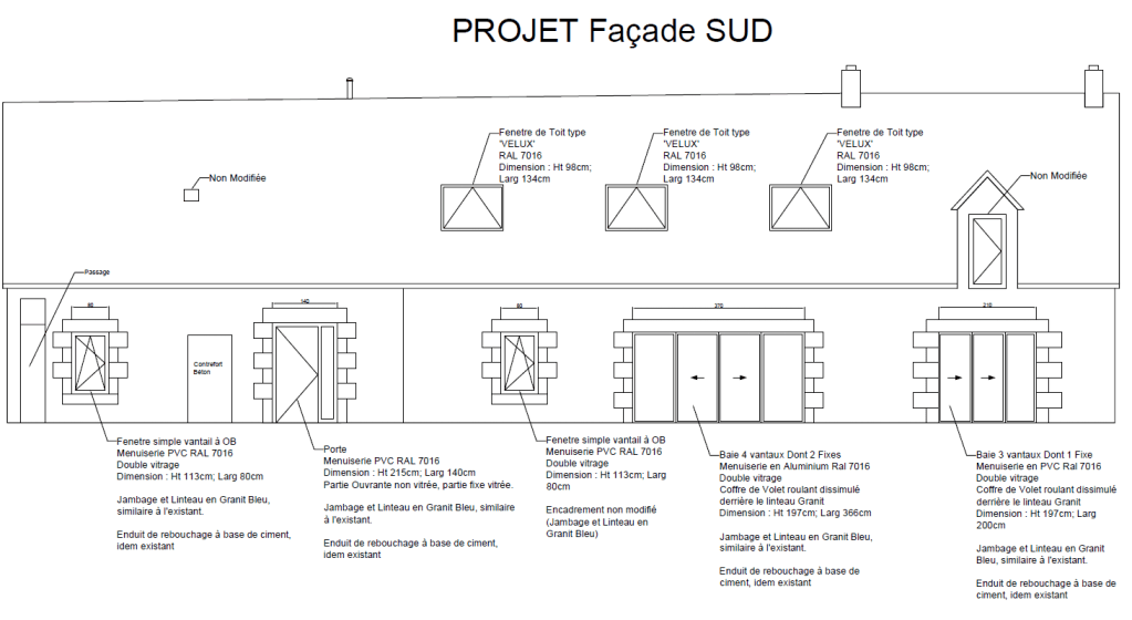 Les 2 premiers projets étaient basés sur le principe de limiter les frais de maçonnerie en se contentant des ouvertures existantes. Nous avions donc pour idée de créer une simple ouverture sur l’arrière de la maison (façade Nord). Après réflexion, nous avons trouvé un solution qui consistait à rassembler des ouvertures existante pour limiter les travaux. Façade sud, nous raccordons une fenêtre et la porte d’entrée pour faire une grande baie coté sud pour le salon et façade nord, création d’un baie panoramique en raccordant les 2 petites fenêtres de la SDB et buanderie existantes.