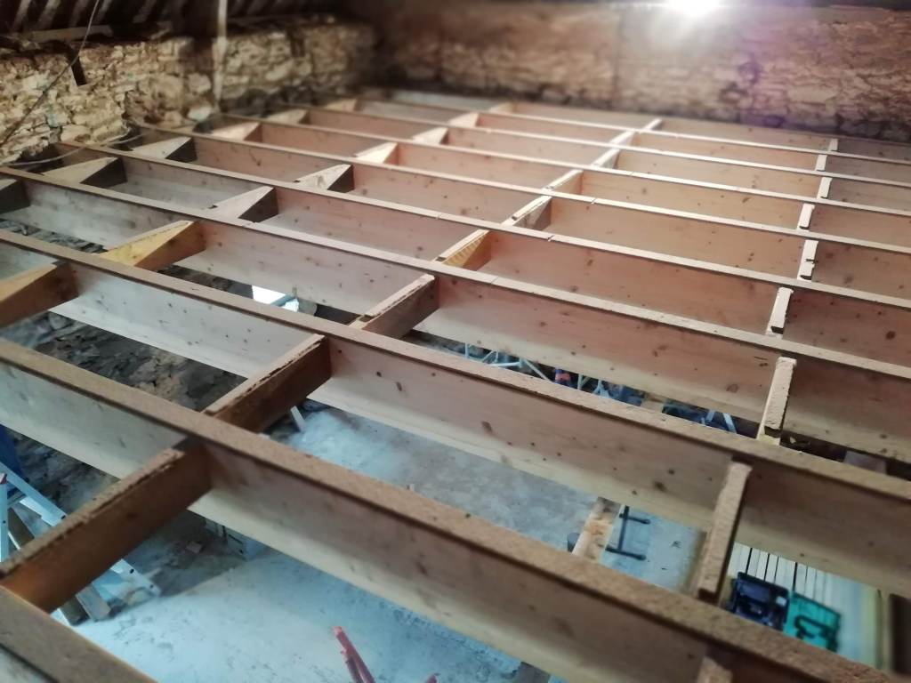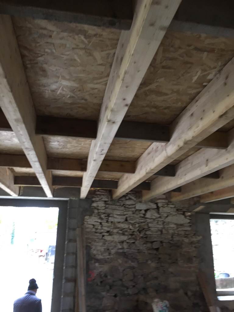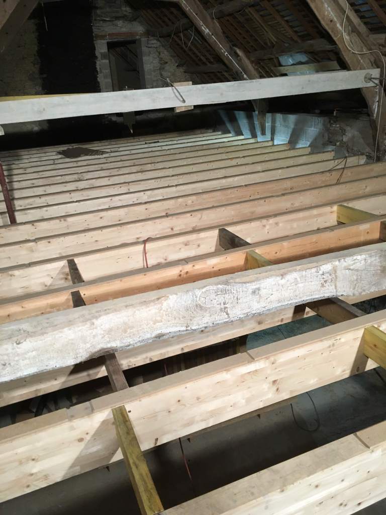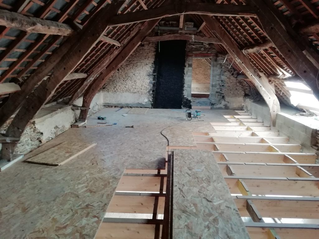 Avec du recul, vous l’aurez compris, j’aurais renforcé mon plancher. Mais c’est toujours facile d’avoir des idées, quand les finances ne sont plus dans le rouge et quand on est tranquille dans son canapé. En fait j’aurais fais une demande devis pour couler une dalle de béton alléger sur 4 ou 5cm. Cela m’aurait permit de créer un plancher chauffant, tout en réduisant probablement l’épaisseur de mon OSB ou en augmentant l’entraxe de mes poutres. Le seul inconvénient, c’est qu’on perd 5cm de hauteur sous plafond et qu’a l’étage sous les rampants ça compte.