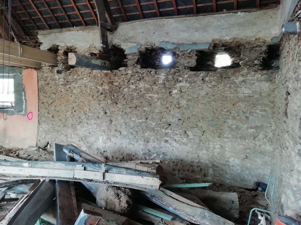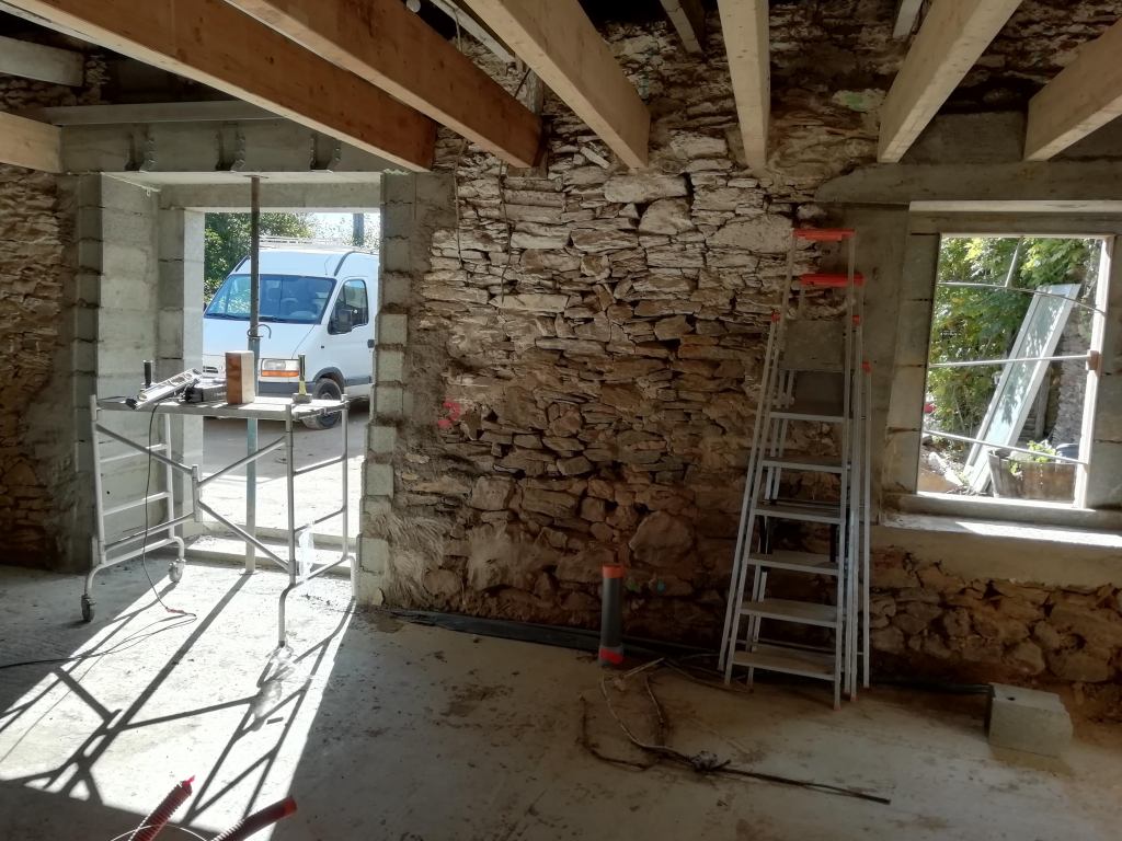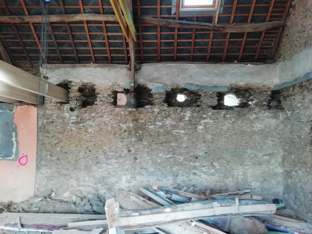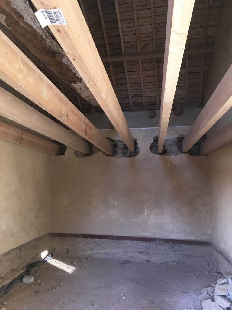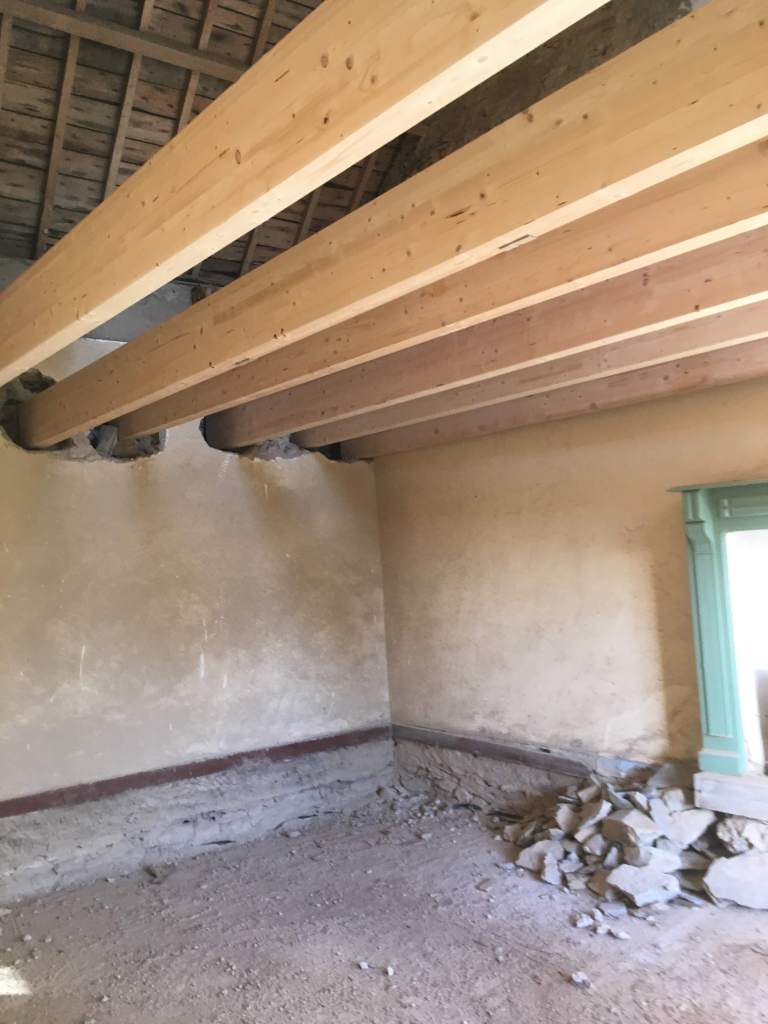 Sur l’une des photos on peut voir que certaines poutres on été découpées en bout. Je voulais qu’elles ailles le plus profondément dans le mur et parfois certaines roches du mur étaient tellement grande que pour ne pas avoir à tout enlever ou créer un grand trou, j’entaillait les poutre pour ne pas être gêné par ces roches.