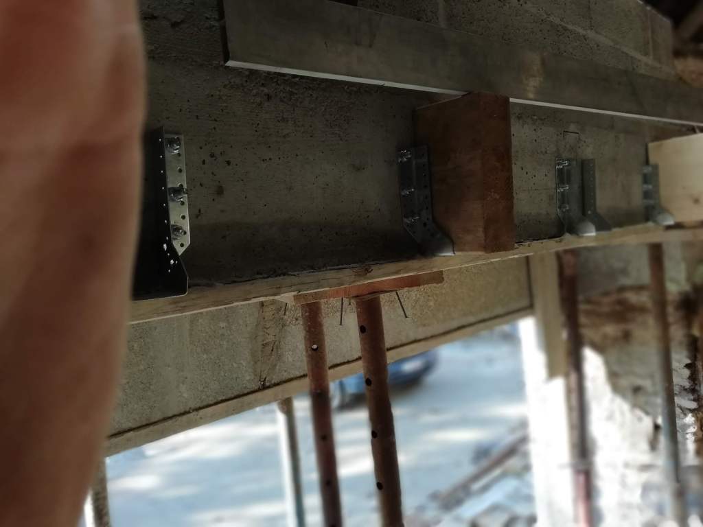 Comme on le voit sur cette dernière photo, j’ai utilisé un étai et un bastaing pour mettre à niveau plusieurs poutres à la fois. En plus, quand c’est bien mis, ça maintien la poutre bien à la verticale, on peut facilement la déplacer de gauche à droite pour gérer l’entraxe, il n’y à plus qu’a boucher.