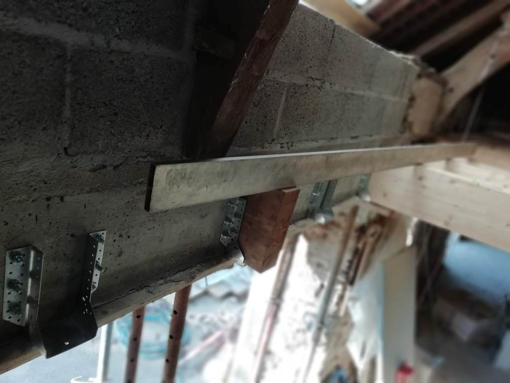 Pour les poutres reprises sur les linteaux, ont à utilisé des sabots métalliques, que l’on goujonne directement dans le linteau. Cette solution facilite énormément le travail, car on à un trou de moins à faire, et surtout la poutre vient simplement se glisser dedans par le dessus à l’aide du palan, ça se fait tout en douceur, un plaisir.